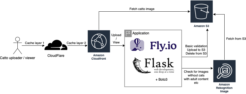 The stack is powered by Cloudflare, AWS CloudFront, Amazon S3Fly.io, and Flask. Thereโ€™s also some built-in anti abuse mechanisms and tagging powered by Amazon Rekognition. I picked tools that I was both:
